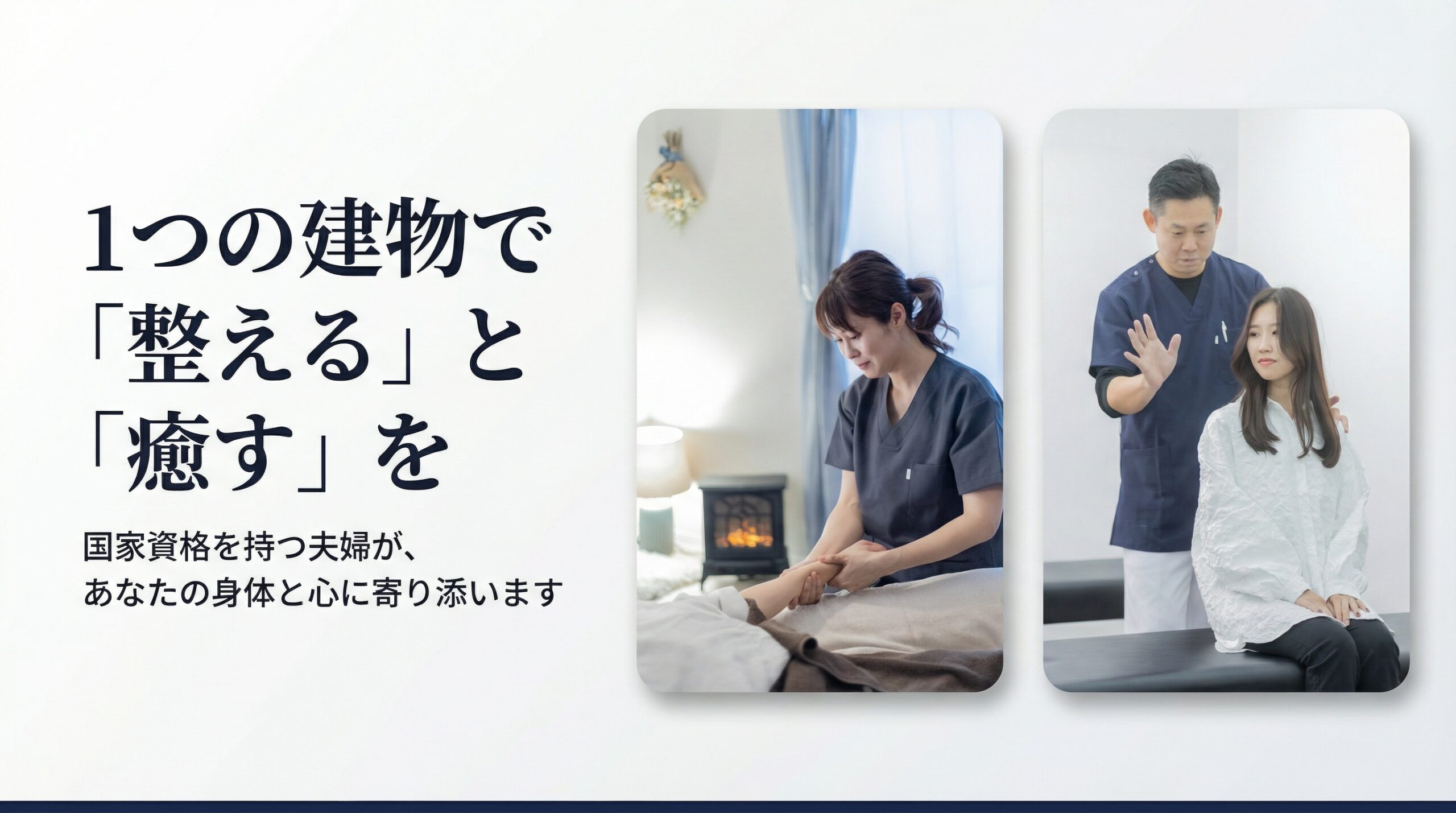 夫婦それぞれの知識と技術が相互に連携し合うことで、単なるリラクゼーションを超えた医学的根拠に基づくトータルケアを実現。
